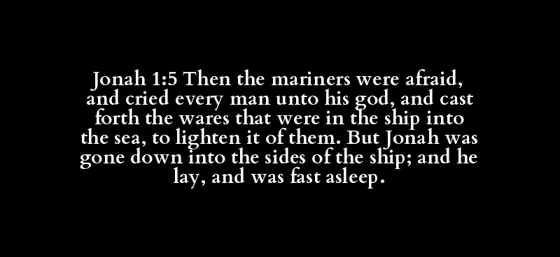 Jonah 1:5 Then the mariners were afraid, and cried every man unto his god, and cast forth the wares that were in the ship into the sea, to lighten it of them. But Jonah was gone down into the sides of the ship; and he lay, and was fast asleep.