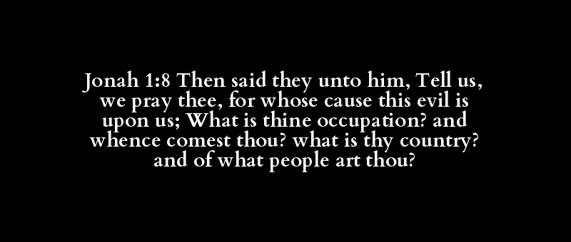 Jonah 1:8 Then said they unto him, Tell us, we pray thee, for whose cause this evil is upon us; What is thine occupation? and whence comest thou? what is thy country? and of what people art thou?