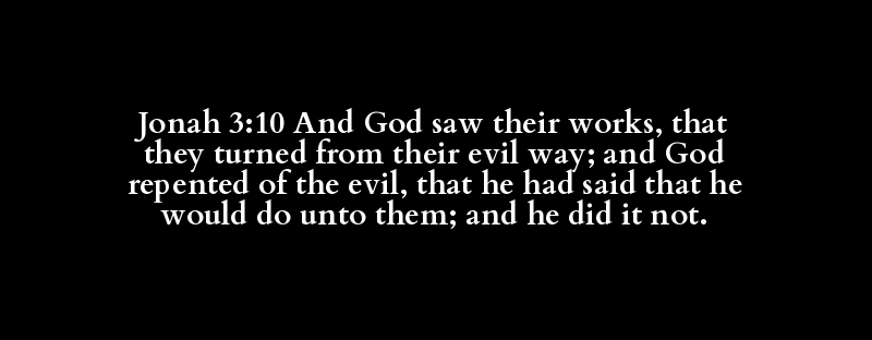 Jonah 3:10 And God saw their works, that they turned from their evil way; and God repented of the evil, that he had said that he would do unto them; and he did it not.