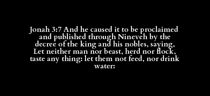 Jonah 3:7 And he caused it to be proclaimed and published through Nineveh by the decree of the king and his nobles, saying, Let neither man nor beast, herd nor flock, taste any thing: let them not feed, nor drink water: