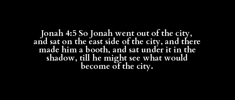 Jonah 4:5 So Jonah went out of the city, and sat on the east side of the city, and there made him a booth, and sat under it in the shadow, till he might see what would become of the city.