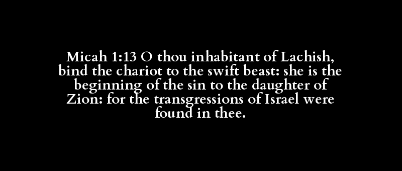 Micah 1:13 O thou inhabitant of Lachish, bind the chariot to the swift beast: she is the beginning of the sin to the daughter of Zion: for the transgressions of Israel were found in thee.