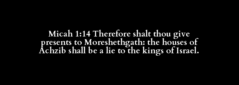 Micah 1:14 Therefore shalt thou give presents to Moreshethgath: the houses of Achzib shall be a lie to the kings of Israel.
