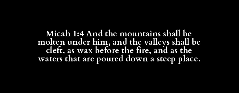 Micah 1:4 And the mountains shall be molten under him, and the valleys shall be cleft, as wax before the fire, and as the waters that are poured down a steep place.