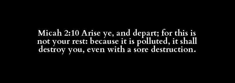 Micah 2:10 Arise ye, and depart; for this is not your rest: because it is polluted, it shall destroy you, even with a sore destruction.