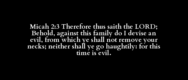 Micah 2:3 Therefore thus saith the LORD; Behold, against this family do I devise an evil, from which ye shall not remove your necks; neither shall ye go haughtily: for this time is evil.