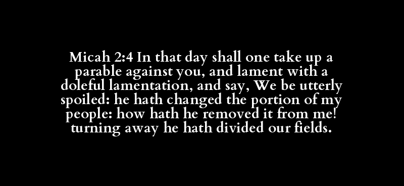 Micah 2:4 In that day shall one take up a parable against you, and lament with a doleful lamentation, and say, We be utterly spoiled: he hath changed the portion of my people: how hath he removed it from me! turning away he hath divided our fields.