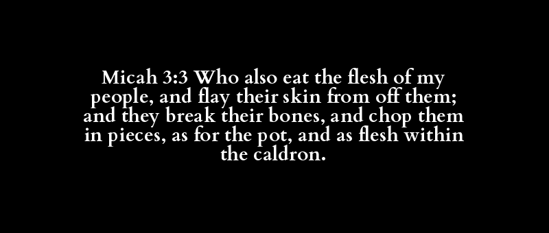 Micah 3:3 Who also eat the flesh of my people, and flay their skin from off them; and they break their bones, and chop them in pieces, as for the pot, and as flesh within the caldron.