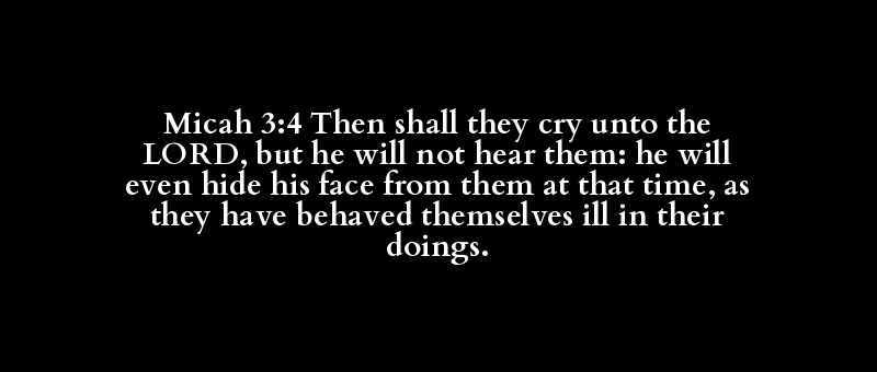 Micah 3:4 Then shall they cry unto the LORD, but he will not hear them: he will even hide his face from them at that time, as they have behaved themselves ill in their doings.