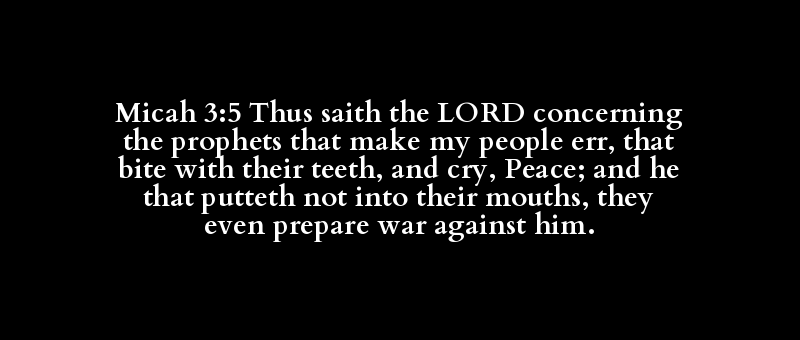 Micah 3:5 Thus saith the LORD concerning the prophets that make my people err, that bite with their teeth, and cry, Peace; and he that putteth not into their mouths, they even prepare war against him.