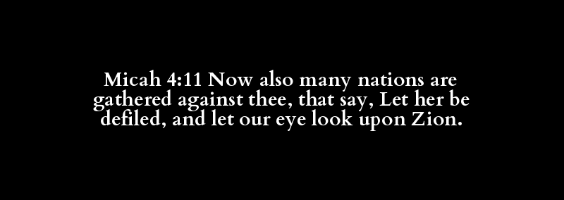 Micah 4:11 Now also many nations are gathered against thee, that say, Let her be defiled, and let our eye look upon Zion.