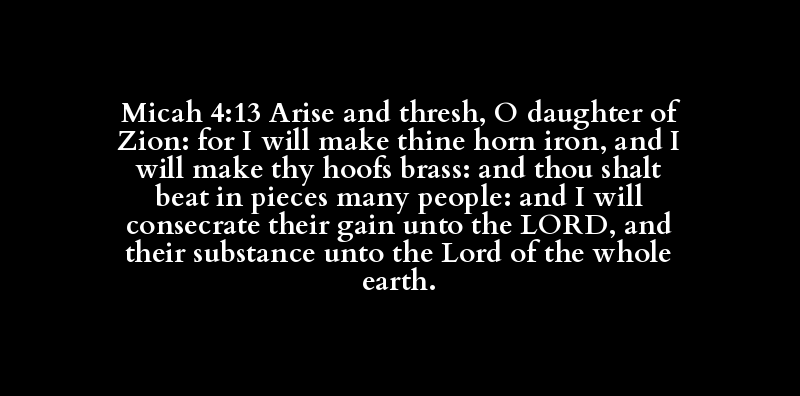Micah 4:13 Arise and thresh, O daughter of Zion: for I will make thine horn iron, and I will make thy hoofs brass: and thou shalt beat in pieces many people: and I will consecrate their gain unto the LORD, and their substance unto the Lord of the whole earth.