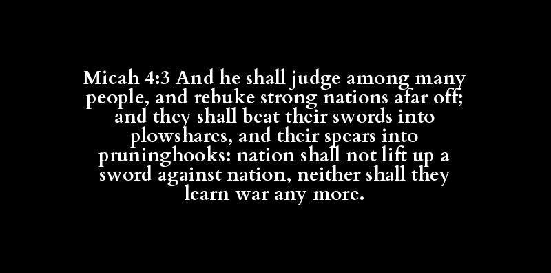 Micah 4:3 And he shall judge among many people, and rebuke strong nations afar off; and they shall beat their swords into plowshares, and their spears into pruninghooks: nation shall not lift up a sword against nation, neither shall they learn war any more.