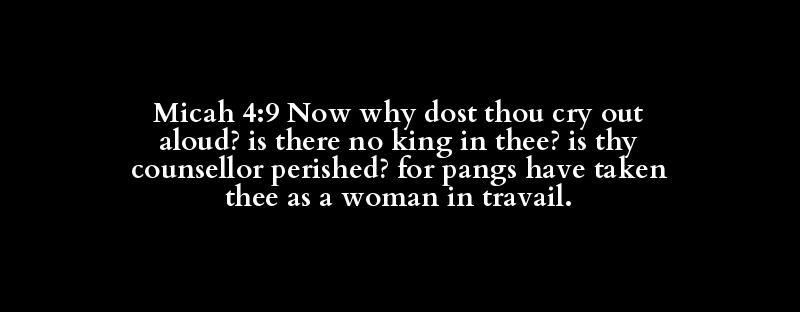 Micah 4:9 Now why dost thou cry out aloud? is there no king in thee? is thy counsellor perished? for pangs have taken thee as a woman in travail.