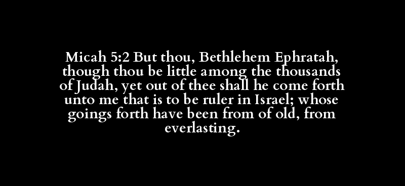 Micah 5:2 But thou, Bethlehem Ephratah, though thou be little among the thousands of Judah, yet out of thee shall he come forth unto me that is to be ruler in Israel; whose goings forth have been from of old, from everlasting.
