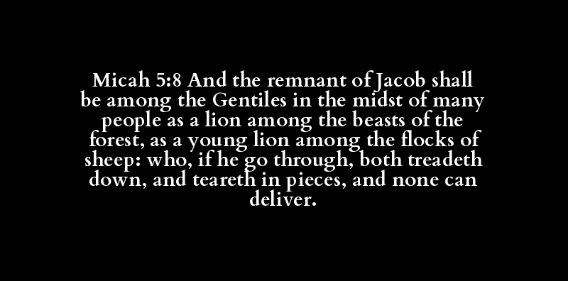 Micah 5:8 And the remnant of Jacob shall be among the Gentiles in the midst of many people as a lion among the beasts of the forest, as a young lion among the flocks of sheep: who, if he go through, both treadeth down, and teareth in pieces, and none can deliver.