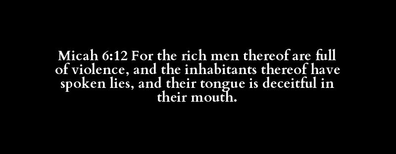 Micah 6:12 For the rich men thereof are full of violence, and the inhabitants thereof have spoken lies, and their tongue is deceitful in their mouth.