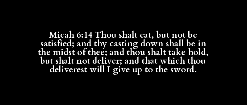 Micah 6:14 Thou shalt eat, but not be satisfied; and thy casting down shall be in the midst of thee; and thou shalt take hold, but shalt not deliver; and that which thou deliverest will I give up to the sword.