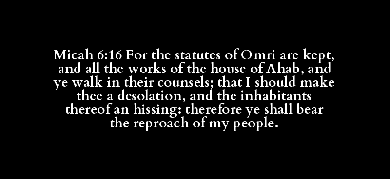 Micah 6:16 For the statutes of Omri are kept, and all the works of the house of Ahab, and ye walk in their counsels; that I should make thee a desolation, and the inhabitants thereof an hissing: therefore ye shall bear the reproach of my people.