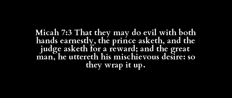 Micah 7:3 That they may do evil with both hands earnestly, the prince asketh, and the judge asketh for a reward; and the great man, he uttereth his mischievous desire: so they wrap it up.