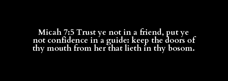 Micah 7:5 Trust ye not in a friend, put ye not confidence in a guide: keep the doors of thy mouth from her that lieth in thy bosom.