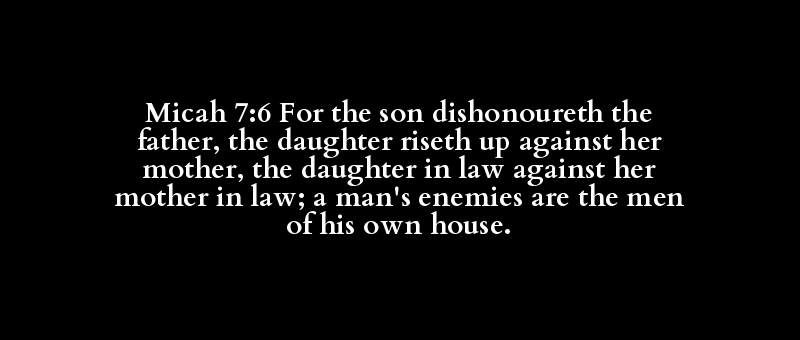 Micah 7:6 For the son dishonoureth the father, the daughter riseth up against her mother, the daughter in law against her mother in law; a man's enemies are the men of his own house.