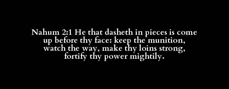 Nahum 2:1 He that dasheth in pieces is come up before thy face: keep the munition, watch the way, make thy loins strong, fortify thy power mightily.