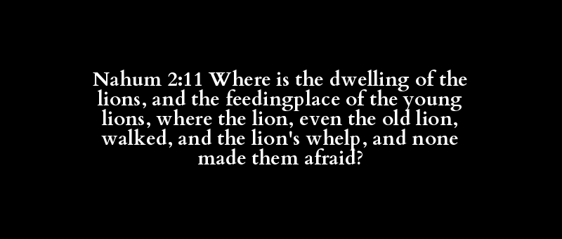 Nahum 2:11 Where is the dwelling of the lions, and the feedingplace of the young lions, where the lion, even the old lion, walked, and the lion's whelp, and none made them afraid?