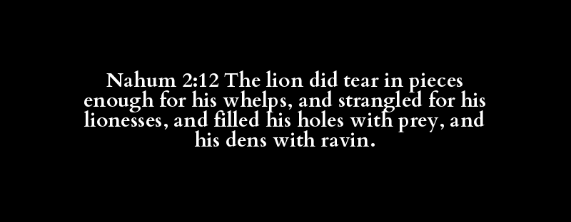 Nahum 2:12 The lion did tear in pieces enough for his whelps, and strangled for his lionesses, and filled his holes with prey, and his dens with ravin.