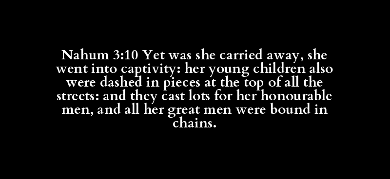 Nahum 3:10 Yet was she carried away, she went into captivity: her young children also were dashed in pieces at the top of all the streets: and they cast lots for her honourable men, and all her great men were bound in chains.