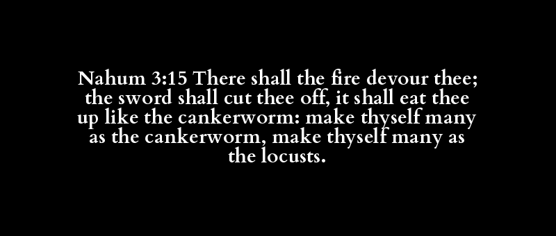 Nahum 3:15 There shall the fire devour thee; the sword shall cut thee off, it shall eat thee up like the cankerworm: make thyself many as the cankerworm, make thyself many as the locusts.
