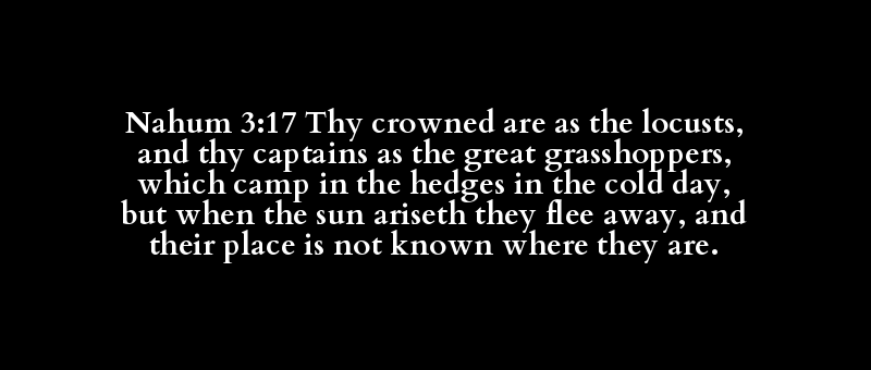 Nahum 3:17 Thy crowned are as the locusts, and thy captains as the great grasshoppers, which camp in the hedges in the cold day, but when the sun ariseth they flee away, and their place is not known where they are.