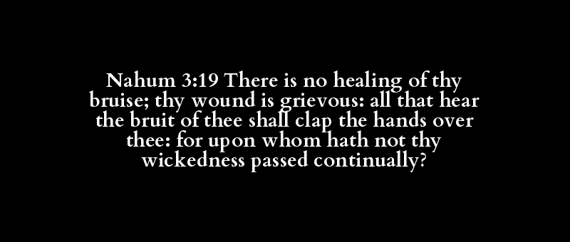 Nahum 3:19 There is no healing of thy bruise; thy wound is grievous: all that hear the bruit of thee shall clap the hands over thee: for upon whom hath not thy wickedness passed continually?