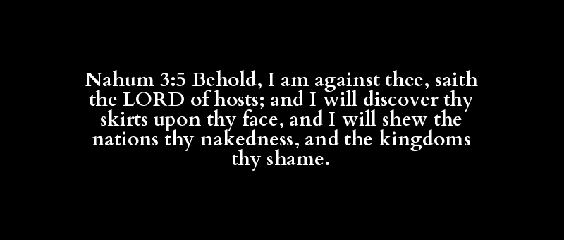 Nahum 3:5 Behold, I am against thee, saith the LORD of hosts; and I will discover thy skirts upon thy face, and I will shew the nations thy nakedness, and the kingdoms thy shame.