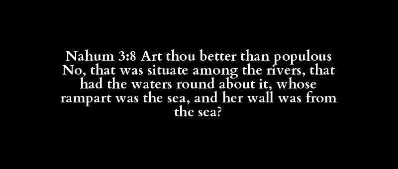 Nahum 3:8 Art thou better than populous No, that was situate among the rivers, that had the waters round about it, whose rampart was the sea, and her wall was from the sea?