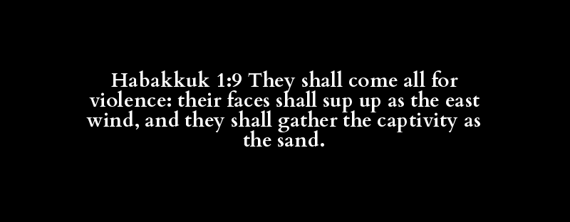 Habakkuk 1:9 They shall come all for violence: their faces shall sup up as the east wind, and they shall gather the captivity as the sand.