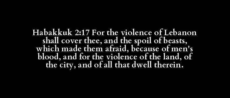 Habakkuk 2:17 For the violence of Lebanon shall cover thee, and the spoil of beasts, which made them afraid, because of men's blood, and for the violence of the land, of the city, and of all that dwell therein.