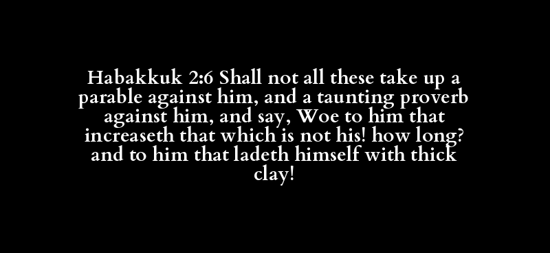 Habakkuk 2:6 Shall not all these take up a parable against him, and a taunting proverb against him, and say, Woe to him that increaseth that which is not his! how long? and to him that ladeth himself with thick clay!