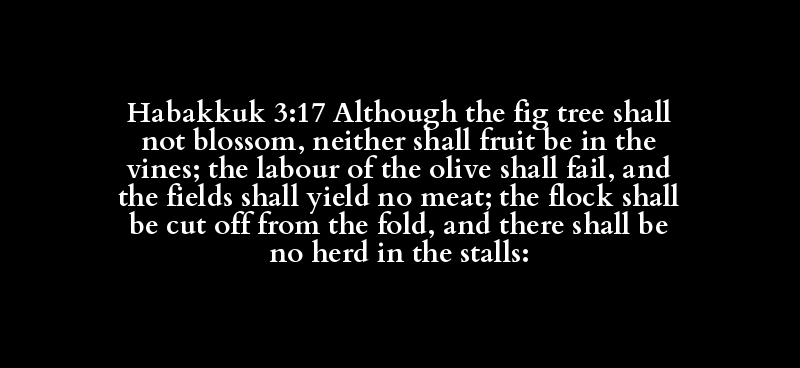 Habakkuk 3:17 Although the fig tree shall not blossom, neither shall fruit be in the vines; the labour of the olive shall fail, and the fields shall yield no meat; the flock shall be cut off from the fold, and there shall be no herd in the stalls: