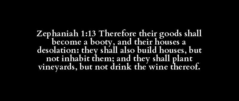 Zephaniah 1:13 Therefore their goods shall become a booty, and their houses a desolation: they shall also build houses, but not inhabit them; and they shall plant vineyards, but not drink the wine thereof.