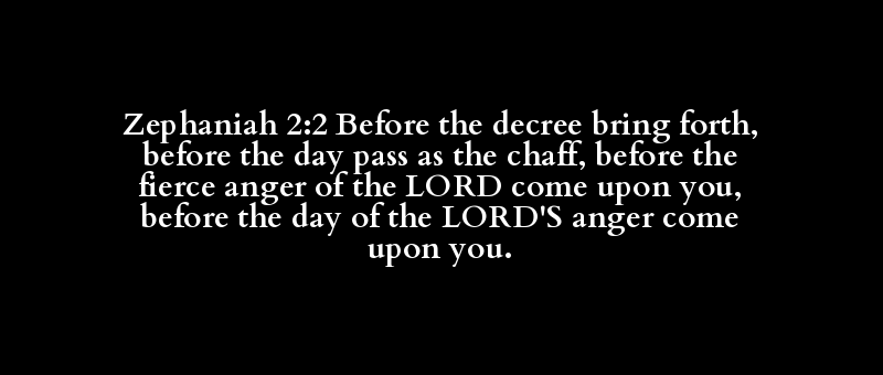 Zephaniah 2:2 Before the decree bring forth, before the day pass as the chaff, before the fierce anger of the LORD come upon you, before the day of the LORD'S anger come upon you.