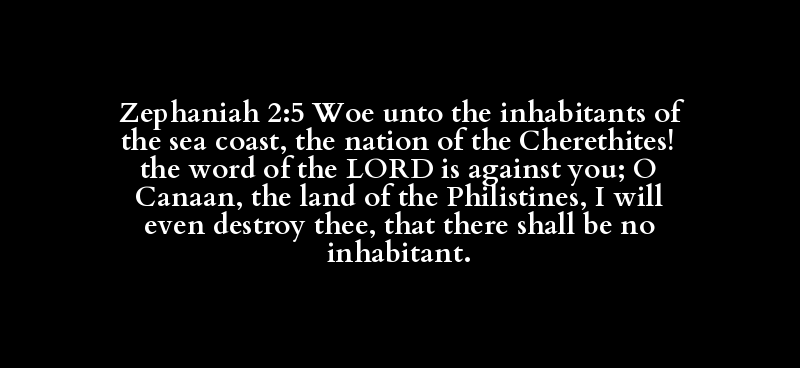 Zephaniah 2:5 Woe unto the inhabitants of the sea coast, the nation of the Cherethites! the word of the LORD is against you; O Canaan, the land of the Philistines, I will even destroy thee, that there shall be no inhabitant.