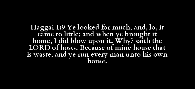 Haggai 1:9 Ye looked for much, and, lo, it came to little; and when ye brought it home, I did blow upon it. Why? saith the LORD of hosts. Because of mine house that is waste, and ye run every man unto his own house.