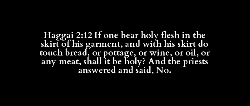 Haggai 2:12 If one bear holy flesh in the skirt of his garment, and with his skirt do touch bread, or pottage, or wine, or oil, or any meat, shall it be holy? And the priests answered and said, No.