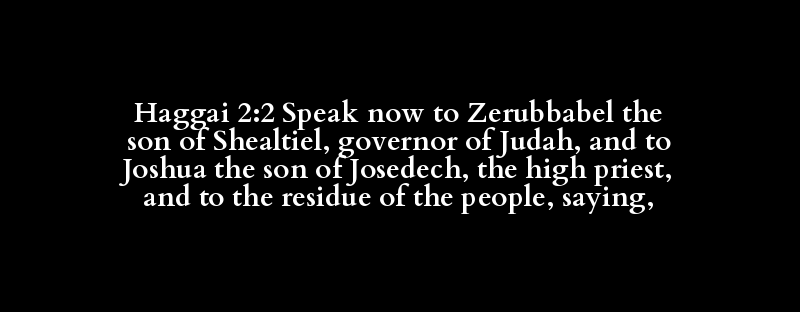 Haggai 2:2 Speak now to Zerubbabel the son of Shealtiel, governor of Judah, and to Joshua the son of Josedech, the high priest, and to the residue of the people, saying,