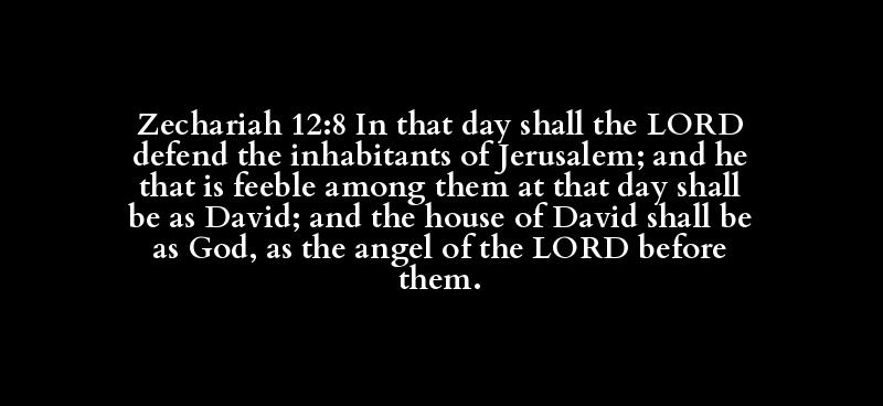 Zechariah 12:8 In that day shall the LORD defend the inhabitants of Jerusalem; and he that is feeble among them at that day shall be as David; and the house of David shall be as God, as the angel of the LORD before them.