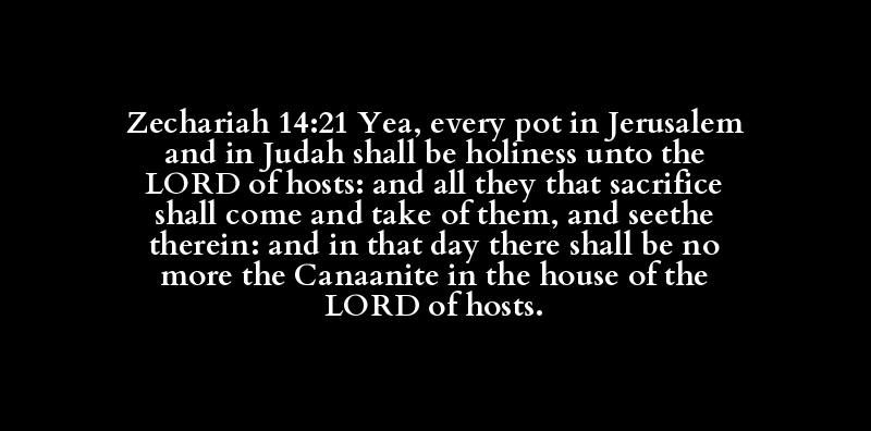 Zechariah 14:21 Yea, every pot in Jerusalem and in Judah shall be holiness unto the LORD of hosts: and all they that sacrifice shall come and take of them, and seethe therein: and in that day there shall be no more the Canaanite in the house of the LORD of hosts.