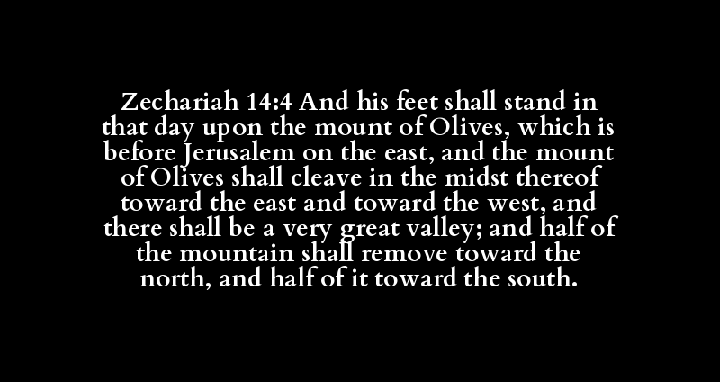 Zechariah 14:4 And his feet shall stand in that day upon the mount of Olives, which is before Jerusalem on the east, and the mount of Olives shall cleave in the midst thereof toward the east and toward the west, and there shall be a very great valley; and half of the mountain shall remove toward the north, and half of it toward the south.