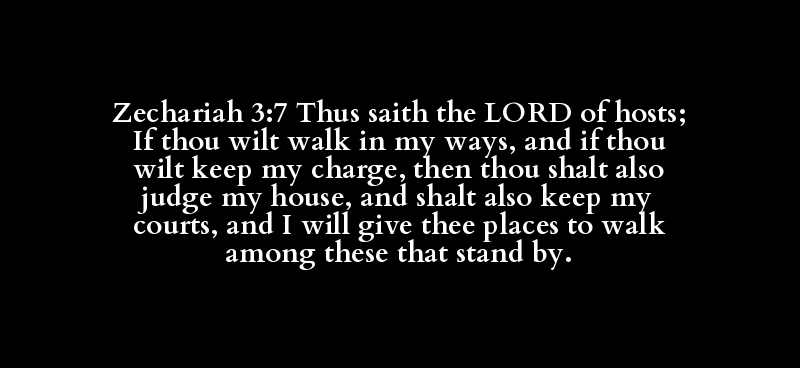 Zechariah 3:7 Thus saith the LORD of hosts; If thou wilt walk in my ways, and if thou wilt keep my charge, then thou shalt also judge my house, and shalt also keep my courts, and I will give thee places to walk among these that stand by.