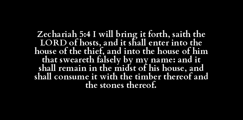 Zechariah 5:4 I will bring it forth, saith the LORD of hosts, and it shall enter into the house of the thief, and into the house of him that sweareth falsely by my name: and it shall remain in the midst of his house, and shall consume it with the timber thereof and the stones thereof.